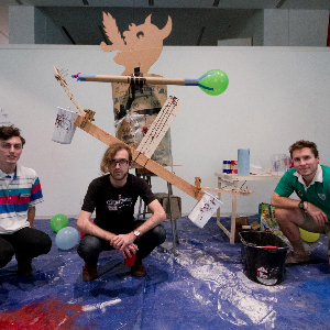 Holla’ Pain Yo is a competitive game in which two teams compete to lighten a bucket of jalapeño water at their end of a shared seesaw and pop the balloon hovering above it.